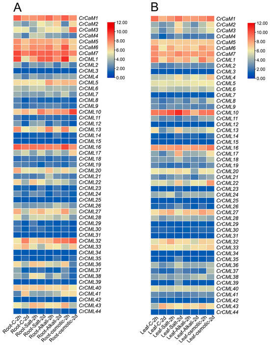 Heatmaps showing the expression changes in the RNA-Seq data for the CrCaMs/CrCMLs under high salinity, alkaline, and high osmosis stresses. The expression levels of each gene are shown in values of log2 (FPKM+1). The expression differences of 51 CrCaMs/CrCMLs in the root (A) and leaf (B) after the 2 h and 2 d abiotic stress challenges.