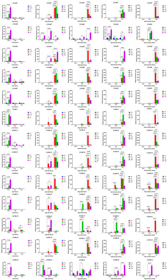 Quantitative RT-PCR detection of the expression levels of the thirteen CrCaMs/CrCMLs responding to different abiotic stresses, including heat (45 °C), high salt (600 mM NaCl), alkaline (150 mM NaHCO3, pH 8.2), high osmotic stress (300 mM mannitol), and H2O2 (10 mM) oxidative stress. The relative expression values were calculated using the 2−ΔCt method with the housekeeping gene, CrEF-1α, as a reference gene. The bars show the mean values ± SDs of n = 3–4 technical replicates. Asterisks indicate significant differences from the CK (control check, without stress, Student’s t-test, * p < 0.1, and ** p < 0.01, *** p < 0.001, and **** p < 0.0001).
