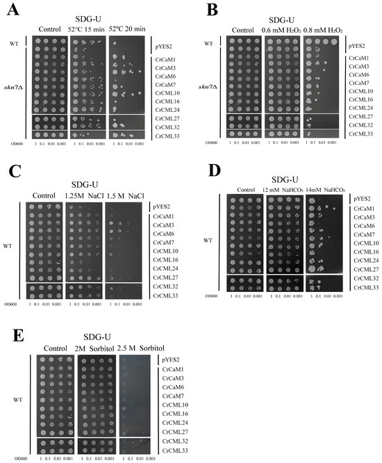 The functional confirmation in yeast strain WTs and skn7Δ by expressing ten CrCaMs/CrCMLs. Yeast cultures (WT: 52 °C for 30 min for heat stress; skn7Δ: 52 °C for 15 min for heat stress; or WT without challenges) were adjusted to OD600 = one, and 2 μL of serial dilutions (ten-fold) were spotted on SDG-Ura medium plates supplied with specific challenge stressors. The plates were incubated for 2–5 days at 30 °C. Functional identification of ten CrCaMs/CrCMLs in yeast using a heterologous expression assay. (A) The thermotolerance confirmation in the yeast mutant strain, skn7Δ; (B) H2O2 oxidative stress tolerance confirmation in the yeast mutant strain, skn7Δ; (C) high-salinity tolerance confirmation in the WT yeast on NaCl-surplus SDG-Ura medium plates; (D) high-alkaline tolerance confirmation in the WT yeast on NaHCO3-surplus SDG-Ura medium plates; and (E) the high-osmotic-stress tolerance confirmation in the WT yeast on sorbitol-surplus SDG-Ura medium plates.