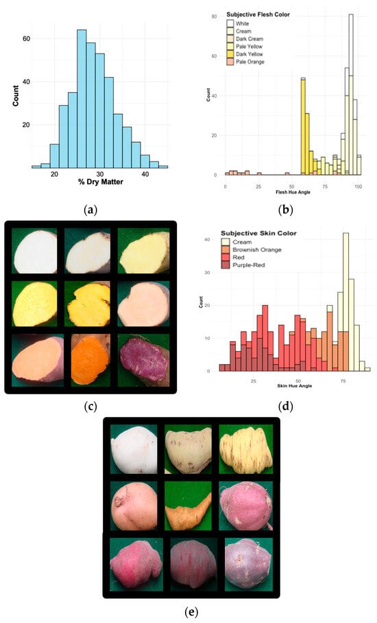 Distribution of sweet potato storage root traits. Phenotypes are represented as follows: (a) histogram of percent dry matter; (b) bar chart of flesh hue angle; (c) subjective flesh color where ratings are 1 = white (top left), 2 = cream (top middle), 3 = dark cream (top right), 4 = pale yellow (middle left), 5 = dark yellow (middle), 6 = pale orange (middle left), 7 = intermediate orange (bottom left), 8 = dark orange (bottom middle), and 9 = strongly pigmented with anthocyanins (bottom right) [17]; (d) histogram of skin hue angle; (e) subjective skin color where ratings are 1 = white (top left), 2 = cream (top middle), 3 = yellow (top right), 4 = orange (left middle), 5 = brownish orange (middle), 6 = pink (right middle), 7 = red (bottom left), 8 = purple-red (bottom middle), and 9 = dark purple (bottom right) [17].