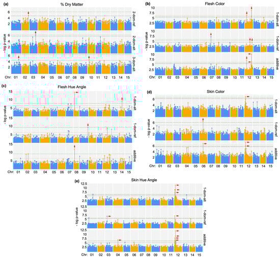 Manhattan plots of sweet potato storage root trait SNPs identified using GBSpoly GWAS analyses. Following GWAS analyses as described in the Materials and Methods, Manhattan plots were prepared for the traits of (a) percent dry matter, (b) flesh color, (c) flesh hue angle, (d) skin color, and (e) skin hue angle. For each trait, Manhattan plots displaying the most significant SNPs for each genetic model (1-dom-ref, 1-dom-alt, 2-dom-ref, 2-dom-alt, 3-dom-ref, 3-dom-alt, and additive) are illustrated.