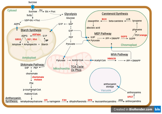 Connections of central carbon metabolism to starch, carotenoid, and anthocyanin biosynthesis with candidate metabolic enzymes from this study highlighted in red. Abbreviated core metabolic pathways are represented including glycolysis, the tricarboxylic acid (TCA) cycle, mevalonic acid (MVA) pathway, shikimate pathway, and the methylerythritol 4-phosphate (MEP) pathway. Sucrose from photosynthetic “source” tissue enters the sweet potato storage root cell. The disaccharide sucrose can be hydrolyzed to glucose (Glc) and fructose (Fruc) by invertase (Inv), and both Glc and Fruc can enter glycolysis. Alternately, sucrose synthase (SuSy) can convert sucrose to uridine-5-diphoshate (UDP)-glucose plus Fruc, which can enter glycolysis. UDP-glucose can be converted to adenosine-5-diphosphate-glucose (ADPG) that can enter the amyloplast (specialized starch-storing plastid) for starch synthesis. Alternately, ADPG can be synthesized from glucose 1-phosphate (G1P) inside the plastid by ADPG pyrophosphorylase (AGPase). Granule-bound starch synthases (GBSS) use ADPG to synthesize amylose, and soluble starch synthases (SSs) along with other enzymes synthesize amylopectin from ADPG. Starch phosphorylase (SP) is involved in starch breakdown. Carotenoid synthesis occurs in chromoplasts. The carotenoid precursors, isopentyl pyrophosphate (IPP), and dimethylallyl pyrophosphate (DMAPP), can be derived from the cytosolic MVA pathway, which uses acetyl CoA (acetyl Coenzyme A) as a precursor with the rate-limiting step being catalyzed by HMG CoA reductase (HMGCR), or IPP and DMAPP can be derived from the plastid MEP pathway, which uses the glycolytic intermediates glyceraldehyde 3-phosphate (G3P) and pyruvate as precursors. Geranylgeranyl pyrophosphate synthase (GGPS) synthesizes geranylgeranyl pyrophosphate (GGPP) from IPP and DMAPP. Phytoene is synthesized by phytoene synthase (PSY), which is stabilized by the ORANGE protein. Beta-carotene hydroxylase (BCH) oxidizes β-carotene, thereby decreasing β-carotene levels. The isopropanoid pathway for anthocyanin biosynthesis is also illustrated. The glycolytic intermediate phosphoenolpyruvate (PEP) and erythrose 4-phosphate (E4P) from the pentose phosphate cycle (not illustrated) can enter the shikimate pathway wherein chorismate mutase catalyzes the rate-limiting step and the flavonoid precursor phenylalanine (Phe) is synthesized. Chalcone-flavanone isomerase (CFI), flavanone 3-hydroxylase (F3H), dihydroflavonol reductase (DFR), and UDP-glucose flavonoid 3-O-glucosyltransferase (UFGT) act consecutively in the synthesis of anthocyanins, which are stored in vacuoles. Abbreviations: ADPG—ADP-glucose; AGPase—ADP-glucose pyrophosphorylase; BCH—beta-carotene hydroxylase; CFI—chalcone-flavanone isomerase; DFR—dihydroflavonol reductase; DMAPP—dimethylallyl pyrophosphate; E4P—erythrose 4-phosphate; F3H—flavanone 3-hydroxylase; G1P—glucose 1-phosphate; G6P—glucose 6-phosphate; G3P—glyceraldehyde 3-phosphate; GBSS—granule-bound starch synthase; GGPP—geranylgeranyl pyrophosphate; GGPS—geranylgeranyl pyrophosphate synthase; HMGCR—hydroxy methyl glutarate CoA reductase; IPP—isopentenyl pyrophosphate; MEP—methylerythritol 4-phosphate; MVA—mevalonic acid pathway; PEP—phosphoenolpyruvate; Phe—phenylalanine; PSY—phytoene synthase; SP—starch phosphorylase; SS—starch synthase; TCA—tricarboxylic acid cycle; UGFT—UDP-glucose flavonoid 3-O-glucosyltransferase.