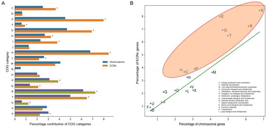 Percentage distribution of individual COG categories in the accessory pangenomes of chromosomes and plasmids from Rhizobium genomes. (A) Bar chart showing the percentage share of COG categories in the analyzed pangenomes, with statistically significant differences (p value < 0.05) marked by an asterisk. (B) Scatter plot showing the relationship between the percentage of individual COG categories in the accessory pangenomes of chromosomes (x-axis) and plasmids (y-axis). The 1:1 line was shown in green. COG categories significantly more abundant in plasmid pangenome are marked with a red ellipse.