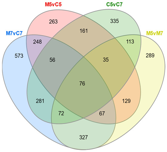 The transcriptomes were sequenced and quantified as described in the Materials and Methods section. For individual samples, 13,654,634 to 44,837,078 high-quality paired-end reads were obtained, with 88–99% of the reads mapped to the reference genome of R. leguminosarum bv. trifolii TA1 (Supplementary Table S1). Of the 7028 CDSs annotated in the RtTA1 genome, 6945 to 6975 genes were represented in this RNA-seq study across the different growth conditions (Supplementary Tables S2–S5). A key aspect of the RNA-seq analysis was identifying DEGs whose expression levels changed significantly under the tested conditions (Supplementary Table S6). Differential gene expression was compared across four experimental conditions: (1) M1 minimal medium vs. 79CA complete medium at pH 7 (M7vC7), (2) M1 minimal medium vs. 79CA complete medium at pH 5 (M5vC5), (3) pH 5 vs. pH 7 in 79CA complete medium (C5vC7), and (4) pH 5 vs. pH 7 in M1 minimal medium (M5vM7) (Table 1). These abbreviations (M7vC7, M5vC5, C5vC7, and M5vM7) will be used throughout this manuscript to refer to the different experimental conditions. During the growth of RtTA1 under these conditions, 1035 to 1700 genes (14.7–24.2% of the total RtTA1 CDSs) were found to be significantly differentially expressed (Table 1), with downregulated genes predominating in all comparisons except M7vC7.