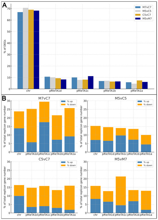Differential expression analysis and genomic distribution of DEGs in R. leguminosarum bv. trifolii TA1 under various growth conditions. (A) The percentage of DEGs in each replicon, relative to the total number of DEGs in the whole genome, is plotted for each experimental condition. (B) Genomic distribution of DEGs across individual replicons of R. leguminosarum bv. trifolii TA1 under the tested growth conditions. For each replicon, the percentage of DEGs relative to the total number of CDSs is shown, with downregulated (orange) and upregulated (blue) genes indicated. The panels correspond to the experimental conditions described above.