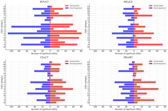 A significant portion of the DEGs (30.88%, 36.04%, 36.49%, and 39.89% in the M7vC7, M5vC5, C5vC7, and M5vM7 experimental variants, respectively) represented genes with unknown functions. This finding indicates that a substantial number of genes involved in the stress response of R. leguminosarum under the tested conditions have not yet been characterized. These uncharacterized DEGs could potentially play novel roles in adaptation to acidic conditions and nutrient limitation, underscoring the need for further investigation to determine their specific contributions to stress tolerance and metabolic reprogramming [34].