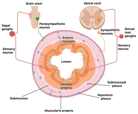 The neuro-immune unit can operate in the CNS (brain and spinal cord) or the peripheral nervous system (somatosensory and autonomic nervous systems). Neurons and glial cells in the CNS send efferent signals to peripheral tissues via neurotransmitters and neuropeptides, and immune cells secrete cytokines that bind neuron receptors, either locally or systemically, in the CNS. Some nerves can also signal information back from the tissue to the CNS and then, through efferent nerves, instruct peripheral immune cells for an effective immune response. The vagus nerve is one of the twelve cranial nerves representing the main extrinsic parasympathetic nerve connecting the brain and the proximal colon. It is mainly implicated in modulating the intestinal immune response, depending on the composition of the intestinal microbiota or gut inflammation; the brain promotes, through vagal efferent function, a regulatory signal that controls pro-inflammatory cytokine release. Distal colon parasympathetic innervation originates from the sacral spinal nerves, and both nerves coordinately act as a network [23]. The mucosa and secondary lymphoid organs are highly innervated by the ANS, which is composed of the sympathetic nervous system (SNS), parasympathetic nervous system (PNS), and enteric nervous system (ENS). Cell bodies of the SNS (spinal cord) and PNS (brain and sacral spinal cord) are localized in spinal cord ganglia (extrinsic intestinal neurons). In contrast, those from the ENS are entirely contained within the gastrointestinal tract wall (intrinsic intestinal neurons) and are organized in several plexuses throughout the entire intestinal wall (mucosa, submucosa, and muscle layer). The ENS is the most significant neuron accumulation outside the CNS; it is organized into the myenteric plexus (between the circular and longitude muscles) and submucosal plexus [24] (Figure 1). The ENS comprises sensory neurons that sense intestinal content and motor neurons that drive secretory functions and peristalsis [25].