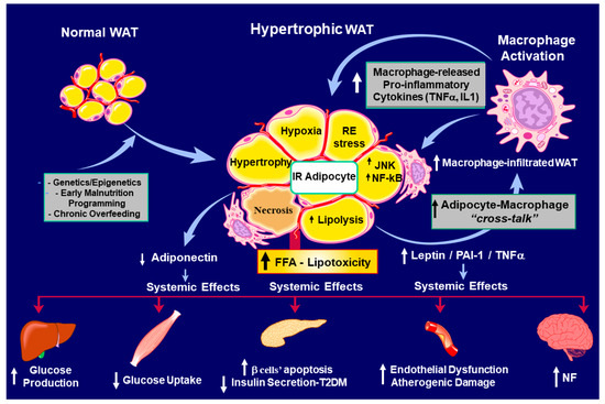 In summary, it is thus important to monitor the detrimental health consequences derived from inflamed, insulin-resistant WAT. This condition, if not appropriately controlled, will result not only in metainflammation but also in chronic hyperglucemia (T2DM), a hypertrophic obesity phenotype, and an increased risk of cardiovascular events. Moreover, a circulating excess of pro-inflammatory factors will induce a dangerous neuroinflammatory condition and, thus, neurological disorders.