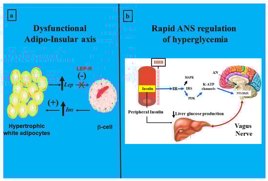 The obesity epidemic and T2DM, originally called the twin epidemic, actually combines with a critical component: IR; this is now known as the triplet epidemic. This is not a minor concept, because the astonishing growth of these problems seriously affects global public health due to the difficulties of the early diagnosis of the IR state. Metabolic abnormalities during a chronic insulin-resistant state of an organism end in cardiovascular-disease-related death. They could therefore be called silent killers. Research has been essential in developing the idea of an association between obesity and diabetes. Thus, it has progressively been linked not only with obesity’s severity but also to weight gain and duration of weight catch-up. Numerous experimental works and epidemiological and clinical studies have cemented an interesting story that, in part, shows the stormy (excessive release of pro-inflammatory cytokines) relationship between obesity and T2DM [43,44]. Indeed, changes in tissue and peripheral lipids could be considered the most prominent promoters of IR [45,46,47]. It is imperative to recognize that WAT is essential for regulating energy expenditure and, therefore, for life. However, the problem appears when this functionality is broken and the adipocyte is no longer a friendly component but a foe. Hyperglycemia takes place, among others, through a disrupted adipo-insular axis function (Figure 3, panel a). Physiologically, a stimulatory effect of insulin on adipocyte leptin production (synthesis and release) occurs; reciprocally, direct leptin-inhibitory activity on β-cell insulin production occurs [48]. Thus, when this endocrine axis becomes dysfunctional, compensatory activity through the ANS (vagus nerve) [49] could be triggered to rapidly modulate glycemia (Figure 3, panel b). Leptin circulating levels directly correlate with body fat mass and increase after food intake, whereas they decrease during fasting [50,51]. Physiologically, insulin acts directly on adipocytes, increasing ob expression and secretion [52]. In turn, leptin reduces pancreatic β-cell function, thus decreasing insulinemia. Leptin’s in vivo role in glucose metabolism has been proposed to be mediated by the ANS [53].