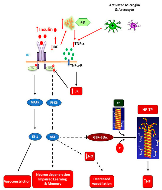 Disrupted brain insulin signaling in Alzheimer’s disease. Amyloid-β (Aβ) accumulation increases TNF-α levels and activates c-Jun N-terminal kinase (JNK). Consequently, IRS-1 becomes inhibited. IR decreases insulin-degrading enzyme (IDE) expression, thereby diminishing IDE-induced Aβ degradation. Reduced brain insulin signaling decreases the inhibition of glycogen synthase kinase-3β (GSK-3β) activity on tau protein (TP) phosphorylation, resulting in hyperphosphorylated TP (PP-TP) production and microtubule depolymerization (MTDP). Consequently, neurofilament tangles (NFTs) deposition is augmented. Therefore, impaired insulin signaling induces neuron degeneration and modifies learning and memory (AD). Additionally, IRS-1 deficiency reduces nitric oxide (NO) production and up-regulates endothelin-1 production, thereby decreasing brain blood flow and increasing neuroinflammation (NF) (reproduced with Karger AG’s permission from Spinedi and Cardinali [20]).