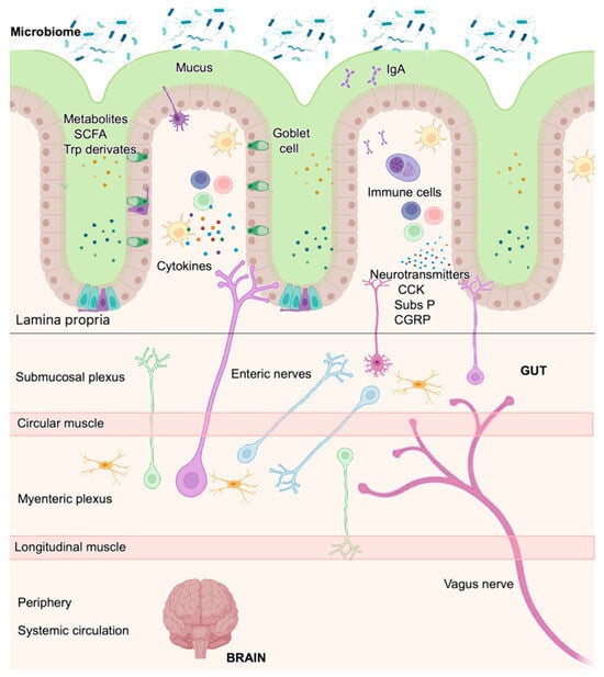 The gut–brain axis was originally described as a unidirectional signaling network that regulated intestinal functions from the CNS in a top-down manner. Nevertheless, extensive studies on the intestinal microbiota have described complex interaction between microbes and the mucosal immune system in the 21st century and have revealed the bidirectional regulation of neurons and immune cells. In the last decade, intestinal microbes were included in the GBA, and we are starting to understand how the enteric microbiota influences the gut–brain relationship (e.g., mental state, emotional regulation, neuromuscular function, regulation of the HPA axis, development of mucosal immune structures, regulation of mucosal immune cells, energy homeostasis, etc.). Commensal microorganisms or their metabolites modulate the CNS and PNS, and sensing microbes is not always considered an injurious signal. The gut microbiota communicates with the CNS through the vagus nerve and systemic circulation and also through the local nervous and immune systems (Figure 6). Nervous and immune cells can sense microorganisms and their metabolites and promote inflammation when dysbiosis is present. Conversely, immune and nervous cells can act on the microbiota composition to restore microbial homeostasis. Gut-innervating TRPV1+ sensory neurons or nociceptor cells produce substance P and CGRP that promote tissue protection and barrier integrity. Chemoablation of these cells promotes intestinal damage, inflammation, and dysbiosis. Colonization of germ-free mice with a consortium of Gram+ Clostridium spp or the administration of substance P restored microbial homeostasis and limited the severe gut inflammation of nociceptor-defective mice.