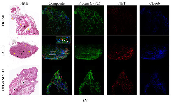 The fresh thrombi extracted from n = 8 patients exhibited a unified, layered structure, which had a very tiny appearance of the NET marker (citrullinated H3 histone) and the CD66b marker (Figure 2A).