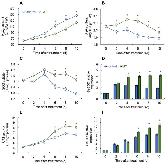 Throughout the entire storage period, the hydrogen peroxide (H2O2) content in the melatonin-treated fresh G. elata tubers consistently decreased compared to the control group. Notably, significant differences were observed from days 6 to 10 (Figure 2A).