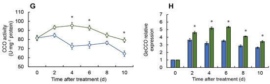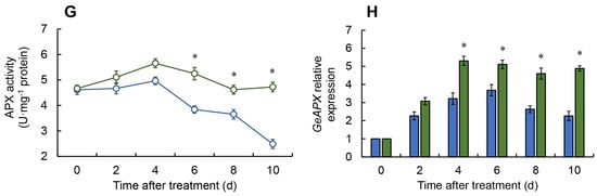 Regarding the APX activity, in both the melatonin treatment and the control groups, fresh G. elata increased from days 0 to 4, after which the that in control rapidly declined. The APX activity in melatonin-treated fresh G. elata decreased from days 4 to 8 but then slightly increased, remaining appreciably enhanced from days 6 to 10 (Figure 2G). After melatonin treatment, the expression of the GeAPX in fresh G. elata was substantially greater in the melatonin treatment group from days 4 to 10 compared to the control (Figure 2H).