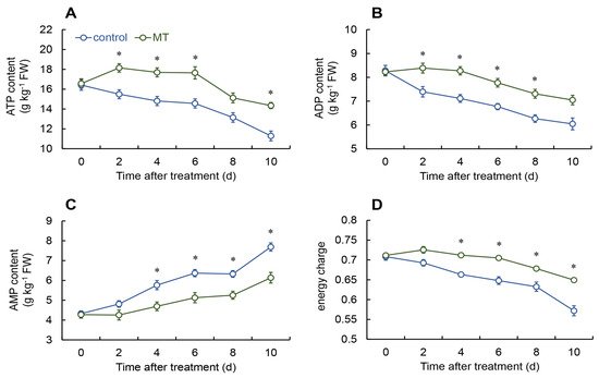 Changes in the content of adenosine triphosphate (ATP) (A), adenosine diphosphate (ADP) (B), adenosine monophosphate (AMP) (C), and energy charge (D) in fresh G. elata after melatonin treatment during storage at room temperature. * denotes significant difference at the level of p < 0.05. Vertical bars represent the standard errors of the means (±SE).