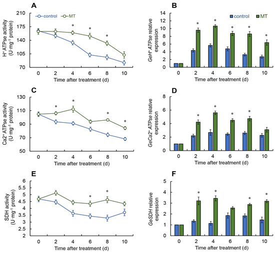 Changes in the activities and expressions of H+-ATPase (A,B), Ca2+-ATPse (C,D), cytochrome c oxidase (CCO) (E,F), and succinate dehydrogenase (SDH) (G,H) in fresh G. elata after melatonin treatment during storage at room temperature. * denotes significant difference at the level of p < 0.05. Vertical bars represent the standard errors of the means (±SE).