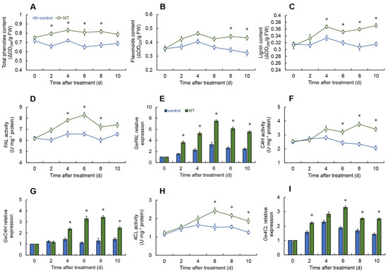 Changes in the content of total phenols (A), flavonoids (B), lignin (C) and the activities and expressions of phenylalanine ammonia-lyase (PAL) (D,E), cinnamate-4-hydroxylase (C4H) (F,G), and 4-coumarate-CoA ligase (4CL) (H,I) in fresh G. elata after melatonin treatment during storage at room temperature. * denotes significant difference at the level of p < 0.05. Vertical bars represent the standard errors of the means (±SE).