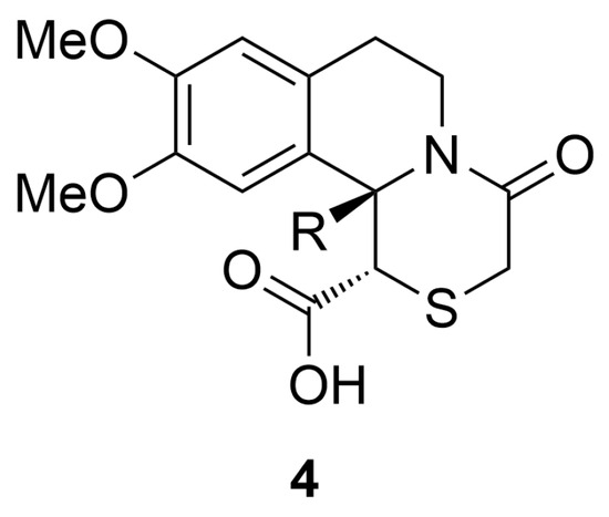 - Pashev, A.; Burdzhiev, N.; Stanoeva, E. Novel angularly substituted [1,4]thiazino[3,4-a]isoquinoline carboxylic acids prepared by cyclic imine-cyclic anhydride reaction. J. Heterocycl. Chem. 2023, 60, 513–518. [Google Scholar] [CrossRef]