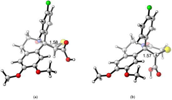 B3LYP/6-31+G(d,p)-optimized geometry for compound 4g: (a) cis-4g in xylene; (b) trans-4g in xylene. Color scheme: C—gray, O—red, N—blue, H—light gray, S—yellow, F—green. CYLview, 1.0b; Legault, C. Y., Université de Sherbrooke, 2009 (http://www.cylview.org, accessed on 25 October 2024).