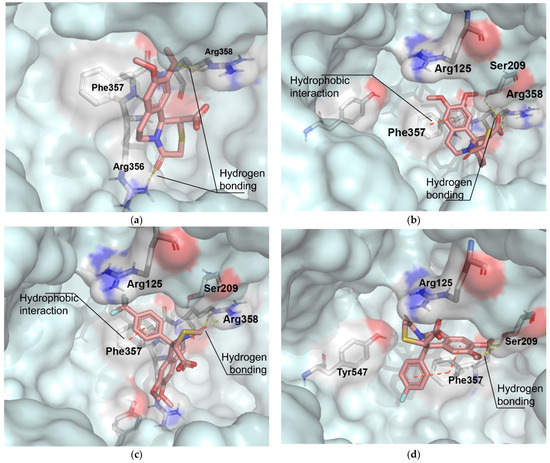 In order to validate the docking protocol, we did the redocking of the ligand into its cocrystalized structure, and the binding mode of the energy minimized pose was reproduced fairly well compared to the X-ray complex crystal structure reported by Mattei et al. (Supplementary Materials) [25]. The optimized geometry of the ionized form of the trans-diastereomers (given by the DFT analysis) was used, since the in vitro DPP-IV screening was performed under physiological conditions. Among the first nine conformers with the most favorable binding affinities that were generated by the docking software (presented in the Supplementary Materials), we selected the lowest energy conformation for our analysis. The binding energies and the type of interaction in our series compounds are listed in Table 3. The interaction modes of the most active compounds 4a, 4e, 4f, and 4g, optimized in xylene, are shown in Figure 4. The core benzo[a]quinolizidine subunit 4a (IC50 = 41.13 µM) is closer to the S2-extended pocket and forms H-bonds with Arg356 and Arg358. The docking modes of the other compounds show that they are closer to the N-terminal recognition region and the S2-pocket and possesed higher inhibitory activity compared to 4a.