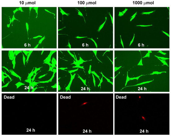 Cytotoxicity evaluation of compound 4g. Mesenchymal stem cells after 6 and 24 h at different concentrations of 4g colored in green; dead cells after 24 h colored in red.