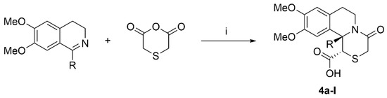 A series of twelve aryl-substituted [1,4]thiazino[3,4-a]isoquinolines 4 analogues were previously synthesized in our lab using a novel synthetic approach between 3,4-dihidroisoquinolines and thiodiacetic anhydride (Scheme 1) [27,28]. The compounds were isolated and purified by column chromatography and subsequent recrystallization.