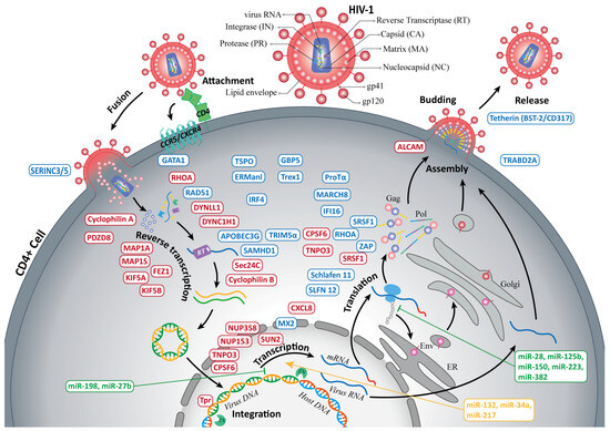 The process of HIV-1 infection of CD4+ cells and the factors that interact with HIV-1. The whole process of the HIV-1 infection cycle includes attachment, fusion, reverse transcription, integration, transcription, translation, assembly, budding, and release. Host dependency factors (shown in red) and miRNA (shown in yellow) in the host cell promote HIV-1 infection and replication, while restriction factors (shown in blue) and miRNA (shown in green) prevent it. Different elements of Gag and Pol are marked by different colors: red, matrix; dark blue, capsid; yellow, nucleocapsid; light blue, protease; purple, reverse transcriptase; green, integrase. These correspond to the colors of the proteins in the schematic diagram of the HIV-1 virus. The factors in the figure are shown schematically, and the positions of factors are not precisely associated with the location/time in the virus–host interaction. This figure is based on published research [1,9,10,11,12,13,14,15,16,17,18,19,20,21,22,23,24,25,26,27,28,29,30,31].