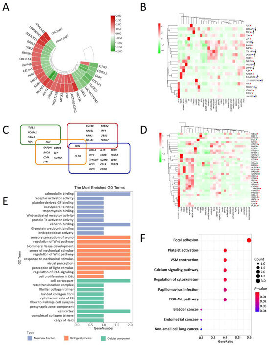 We used the R package cluster Profiler to perform gene ontology (GO) and pathway enrichment analyses (for details, see Section 4). The 452 DEGs in EXP-Blood-HIV-Resistance and the 553 DEGs in EXP-CD4-HIV-Resistance showed significant overlap. Both datasets were enriched in the function related to extracellular biological factor binding, channel activity, cell signaling transduction, and cell differentiation (Figures S17 and S18; Tables S21 and S22). They are also enriched in pathways associated with blood circulatory, neurological diseases, and cancer (Figures S19 and S20; Tables S23 and S24). DEGs in the blood or cells from HIV-infected patients exhibited functions or pathways similar to those of HIV-resistant DEGs (Figures S21–S24, Tables S25–S28). The shared 12 HIV-resistance-related DEGs are involved in functions such as focal adhesion, platelet activation, and vascular smooth muscle contraction (Figure 2E,F; Tables S29 and S30).