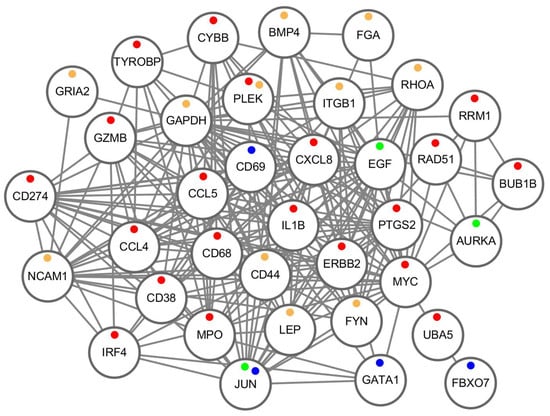 To investigate the function of these potential HIV-1-resistance-related genes in response to HIV exposure, we analyzed the datasets EXP-Blood-HIV-Infection (GSE29429) and EXP-CD4-HIV-Infection (GSE73968), performing quality control for these data (Figures S8 and S9). From EXP-Blood-HIV-Infection, we identified 1458 DEGs (925 up-regulated and 533 down-regulated) (Figure S10, Table S6). From EXP-CD4-HIV-Infection, we identified 274 DEGs in naive CD4+ T cell samples (192 up-regulated and 82 down-regulated) (Figure S11), and 152 DEGs in central memory CD4+ T cell samples (119 up-regulated and 33 down-regulated) (Figure S12). In total, there were 358 DEGs (248 up-regulated and 100 down-regulated) in EXP-CD4-HIV-Infection (Table S7), with 43 up-regulated and 4 down-regulated DEGs showing consistent regulation patterns in both experiments (Table S8). Using the same method to search for HIV-R hub DEGs, we searched for HIV+ hub DEGs and identified nine hub genes (JUN, BUB1B, RAD51, RRM1, GATA1, ERBB2, IRF4, UBA5, and FBXO7) among the DEGs of EXP-Blood-HIV-Infection (Figure S13) and 16 hub genes (JUN, PLEK, CXCL8, MYC, TYROBP, CCL5, MPO, IL1B, CYBB, GZMB, CCL4, CD68, CD69, PTGS2, CD38, and CD274) in EXP-CD4-HIV-Infection (Figure S14). Taking together, there are 36 HIV-related hub genes (Figure 2C). We constructed a PPI network of the 36 hub genes (Figure 3) and investigated their expression in different tissues (Figure 2D). The results show that JUN and PLEK are hub genes common to both HIV resistance and HIV infection. HIV-infection-related hub genes exhibited biased high expression in bone marrow compared to HIV-resistance-related hub genes (p-value < 0.044, Wilcoxon test).