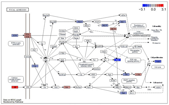 Mapped DEGs in the focal adhesion pathway, derived from a common pathway enrichment analysis based on EXP-Blood-HIV-Resistance and EXP-CD4-HIV-Resistance. Mapped DEGs are shown in colored rectangles, where red denotes up-regulation and blue denotes down-regulation. The colors of the colored boxes denote the protein expression level, corresponded to the color gradient in the upper right of the figure.