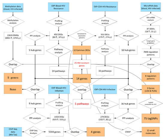 In the global spread of HIV, some individuals exhibit natural resistance to the virus. Notably, the CCR5-Δ32 mutant allele is present at a high frequency (~0.10) in Caucasian populations, whereas it is virtually absent in Asian, Middle Eastern, and American Indian populations. Homozygous individuals for CCR5-Δ32 demonstrate significant resistance to HIV-1 infection, while heterozygous individuals exhibit a heightened resistance compared to wild-type individuals [32,33,34]. Additionally, in Kenya and Africa, some sex workers have been identified as naturally resistant to HIV infection [35,36]. Comparative proteome analysis between HIV-resistant individuals and HIV-negative controls has identified several anti-proteases expressed at higher levels in HIV-1-resistant individuals, playing a role in inhibiting the virus [37,38]. Despite these findings, the genomic data and related analyses of HIV-resistant individuals and populations have not yet been publicly reported. Understanding the molecular mechanism that enables these special individuals and populations to resist HIV-1 infection, as well as identifying potential restriction factors, is crucial for developing effective medicines and vaccines to prevent HIV infection and ultimately cure AIDS. With the development of next-generation sequencing technology, a significant amount of HIV/AIDS-relevant digital data have been generated, such as miRNA, DNA methylation, and ChIP-Seq data [39,40,41]. Integrated analysis of these various data types may yield novel insights. Differentially expressed miRNAs during HIV-1 infection could guide researchers in identifying host proteins that may be manipulated for therapeutic benefits. For instance, a re-analysis of gene expression and methylation regulation in glioblastoma identified an eight-gene signature with prognostic value for glioblastoma patients [42]. Building on previous efforts [43,44,45,46], we have collected and jointly analyzed HIV-related transcriptomic, miRNA, epigenomic, and proteomic data. Due to the complexity of the interaction between HIV and the host, this manuscript aims to predict new potential HIV-related factors, such as HDFs, restriction factors, and miRNAs, along with HIV-resistance pathways, regulatory networks, and related potential clinical biomarkers. This comprehensive approach is intended to provide a diversified perspective for developing new potential anti-HIV/AIDS therapies.