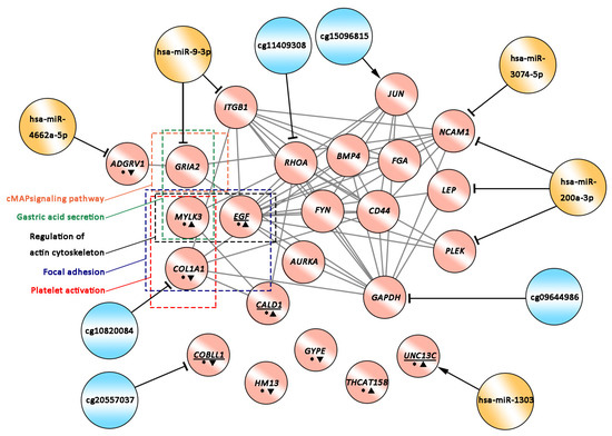 For HIV-R DEGs with different DNA methylation patterns, down-regulated HIV-R DEGs with hyper-methylation were enriched in neurological activities (Figures S25 and S26; Tables S31 and S32), while up-regulated HIV-R DEGs with hypo-methylation were enriched in the cell cycle (Figures S27 and S28; Tables S33 and S34). Tat-binding HIV-R DEGs in EXP-CD4-HIV-Resistance showed a preference for cell cycle function (Figures S29 and S30; Tables S35 and S36). In the pathway enrichment analysis of HIV-resistance-related DEGs, we identified five potential HIV-resistance-related pathways (Table S37), including focal adhesion (Figure 4), regulation of actin cytoskeleton (Figure S31), platelet activation (Figure S32), cAMP signaling (Figure S33) and gastric acid secretion (Figure S34).
