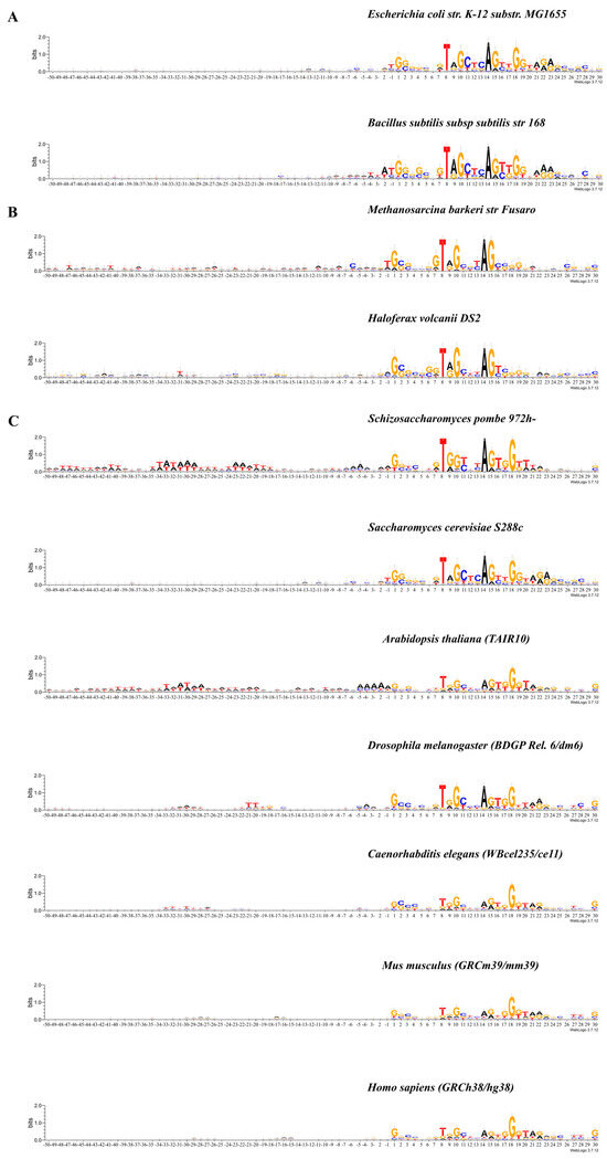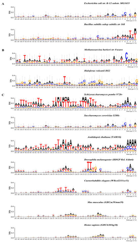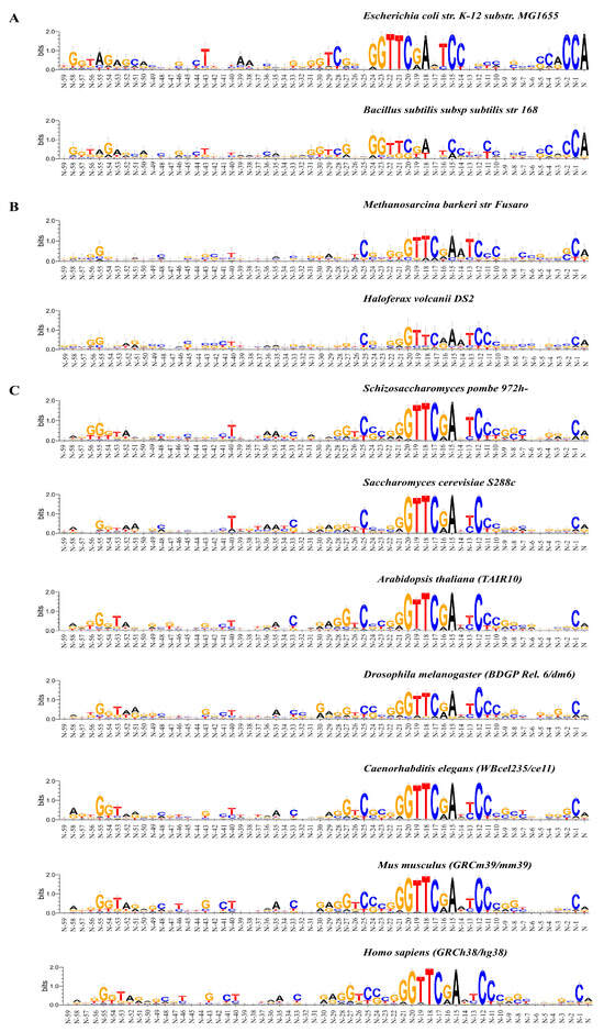 Logo representation with information content 0.4 bits of the 50 bp upstream sequences of tRNA genes of (A) E. coli str. K-12 substr. MG1655 and B. subtilis subsp. subtilis str. 168; (B) M. barkeri str. Fusaro and H. volcanii DS2; (C) S. pombe 972h-, S. cerevisiae S288c, A. thaliana TAIR 10, D. melanogaster BDGP Rel. 6/dm6, C. elegans WBceI235/ce 11, M. musculus GRCm39/mm39, and H. sapiens GRCh38/hg38.