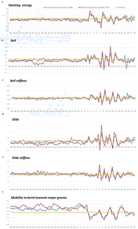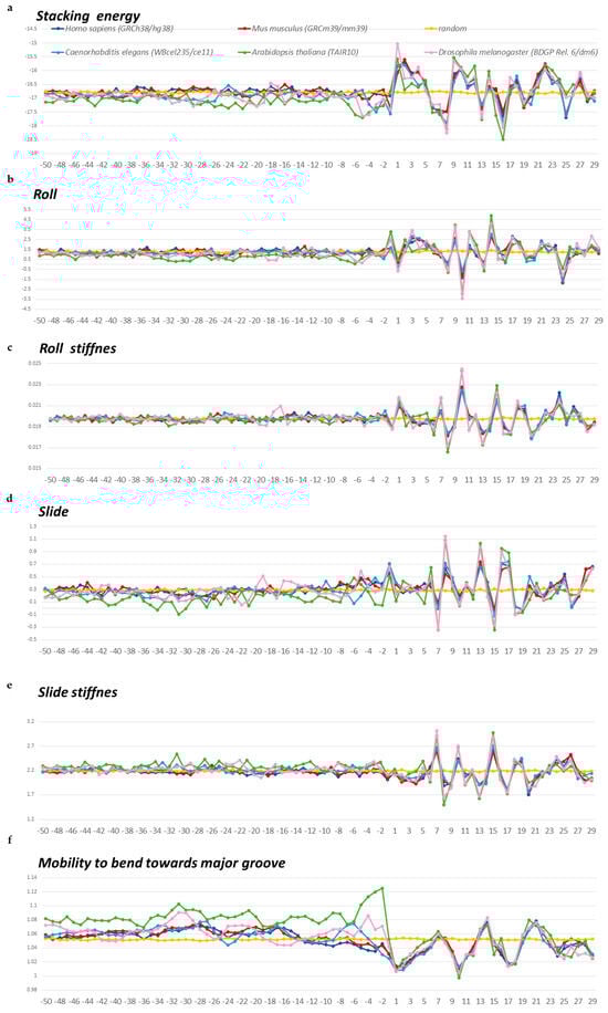 We estimated the structural anisotropy along the naked DNA sequence from the profiles of changes in the stacking energy, roll, slide, and double-helix stiffness values as they change, as well as from data on the mobility of the structure when bending toward the major groove. The values of these parameters for ten possible double-stranded dinucleotides are given in the database DiProDB, http://diprodb.fli-leibniz.de (accessed on 24 April 2024) [18]. The profiles of these characteristics of double-stranded nucleotide sequences ranging from −50 to +30 bp are presented for S. pombe and S. cerevisiae in Figure 5a–f and for A. thaliana, D. melanogaster, C. elegans, M. musculus, and H. sapiens in Figure 6a–f. The profiles of other organisms are in the Supplementary Materials, namely, for E. coli and B. subtilis in Figure S1a–f and for M. barkeri and H. volcanii in Figure S2a–f.