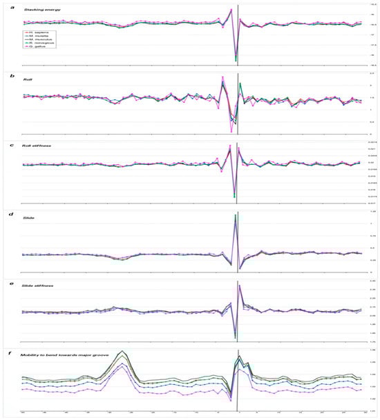 Adapted from our previous work [14]. Local variations of the values of physical and structural parameters in core promoter regions of mRNA genes transcribed by Pol II for C. familiaris (red), D. melanogaster (blue), A. mellifera (black), D. rerio (green), and C. elegans (pink). The transcription start position is indicated by “+1” on the abscissa axis. (a) Stacking energy (in kcal/mol). (b) Roll (in degrees). (c) Stiffness of the duplex structure to roll alteration (in kcal/mol degree). (d) Slide (in angstroms). (e) Stiffness of the duplex structure to slide alteration (in kcal/mol angstrom). (f) Mobility to bend towards major groove (in mobility units).