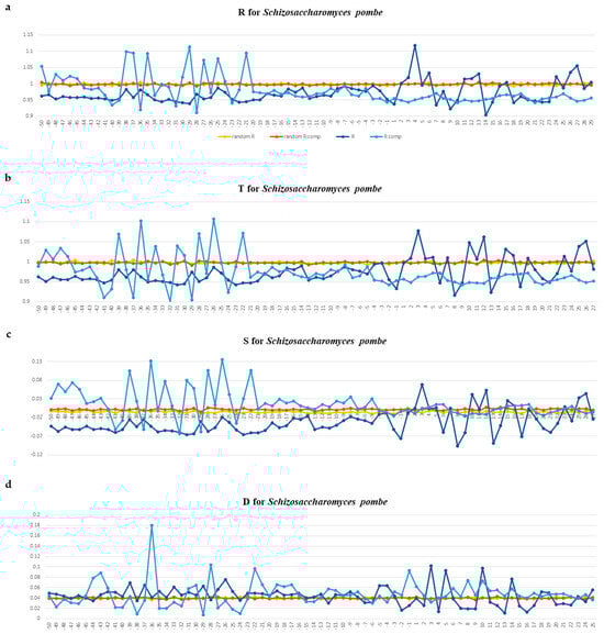Profiles of these physical parameters for tRNA gene fragments between −50 and +30 bp are presented for S. pombe in Figure 8a–d and for A. thaliana in Figure 9a–d. Profiles for other organisms are presented in the Supplementary Materials, viz: Figure S3a–d for E. coli, Figure S4a–d for B. subtilis, Figure S5a–d for M. barkeri, Figure S6a–d for H. volcanii, Figure S7a–d for S. cerevisiae, Figure S8a–d for D. melanogaster, Figure S9a–d for C. elegans, Figure S10a–d for M. musculus, and Figure S11a–d for H. sapiens.