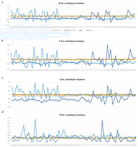 (a–d). Profiles of ultrasonic cleavage indexes and DNase I cleavage indexes for A. thaliana. Upper strand is dark blue, template strand is blue. R—relative cleavage intensities of central position of each of 16 dinucleotides; T—relative cleavage intensities of central position of each of 256 tetranucleotides; S—the combination R and T, namely, the difference between the tetranucleotide cleavage index and the dinucleotide cleavage index in its center S = (T − R)/T. If S < 0, the first and the fourth nucleotides of a tetranucleotide bring down the intensity of the cleavage in the central step; otherwise, they increase it. Relative cleavage intensities of each of the 16 dinucleotides (R index) and relative cleavage intensities of each of the 256 tetranucleotides (T index) were obtained from DNA fragmentation experiments by ultrasound [19]. D—DNase I cleavage [20]. The gene start position is indicated by “+1” on the abscissa axis.