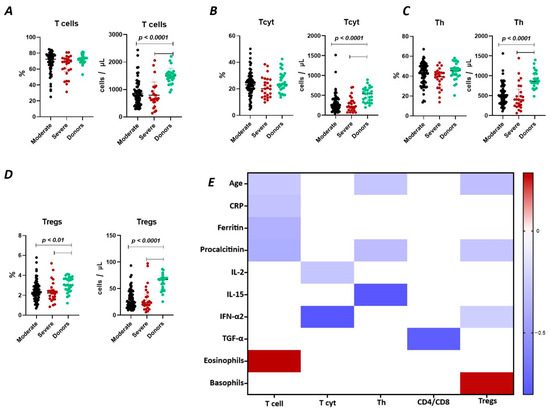 T cell subpopulations in acute COVID-19 and in healthy donors. (A). Relative count and absolute number of T cells. (B). Relative count and absolute number of cytotoxic T cells (CD3+CD8+). (C). Relative count and absolute number of T helper cells (CD3+CD4+). (D). Relative count and absolute number of T regulatory cells (CD3+CD4+CD25bright). (E). Heat map of correlations between T cell subsects and some conventional clinical and laboratory markers in patients with COVID-19.