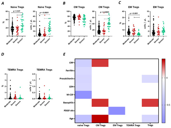 T Regulatory cell subsets in acute COVID-19 and in healthy donors. (A). Relative count and absolute number of naïve regulatory T cells (Naïve Tregs). (B). Relative count and absolute number of central memory regulatory T cells (CM Tregs). (C). Relative count and absolute number of effector memory regulatory T cells (EM Tregs). (D). Relative count and absolute number of terminally differentiated CD45RA+ effector regulatory T cells (TEMRA Tregs). (E). Heat map of correlations between regulatory T cell subsects and some conventional clinical and laboratory markers in patients with COVID-19.