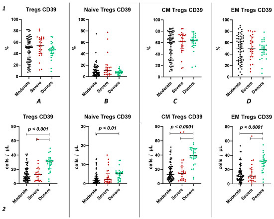 CD39 expression on T regulatory cell subpopulations in acute COVID-19. Upper row (1)—relative counts; bottom row (2)—absolute number. (A). CD39+ regulatory T cells. (B). CD39+ naïve regulatory T cells (Naïve Tregs). (C). CD39+ central memory regulatory T cells (CM Tregs). (D). CD39+ effector memory regulatory T cells (EM Tregs).