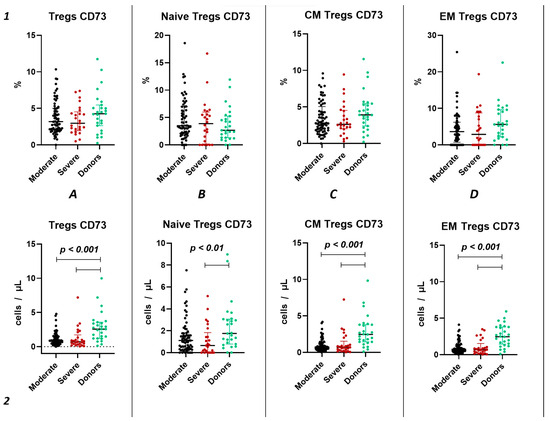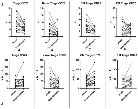 CD73 expression on T regulatory cell subpopulations in acute COVID-19. Upper row (1)—relative counts; bottom row (2)—absolute number. (A). CD73+ regulatory T cells. (B). CD73+ naïve regulatory T cells (Naïve Tregs). (C). CD73+ central memory regulatory T cells (CM Tregs). (D). CD73+ effector memory regulatory T cells (EM Tregs).