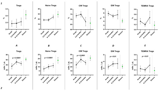 Dynamic changes in Tregs subsets. Upper row (1)—relative counts; bottom row (2)—absolute number. (A). Total T regulatory T cells (Tregs). (B). Naïve Tregs. (C). Central memory (CM) Tregs. (D). Effector memory (EM) Tregs. (E). Terminally differentiated CD45RA+ effector cells (TEMRA) Tregs.