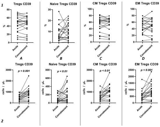 Using the Wilcoxon test, we investigated the temporal changes in CD39 expression on Tregs and their subpopulations in a cohort of 21 patients, spanning from the acute phase of COVID-19 to the convalescent stage at 3–6 months (Figure 7). Our results show no statistically significant differences in the relative counts (Figure 7(1)) of CD39+ Tregs and subpopulations. We observed a significant increase in CD39 expression from the acute to the post-convalescent period in the total Tregs count (435.1 cells/μL (291.2; 736.9) and 841.1 cells/μL (495.3; 1068), respectively) (Figure 7(2A)) and in Treg subpopulations (Figure 7(2B–D)). This includes an increase in Naïve Tregs (57.51 cells/μL (42.91; 144.8) and 158.4 cells/μL (62.42; 317.6), respectively), CM Tregs (517.1 cells/μL (343.8; 865.2) and 1079 cells/μL (587.0; 1258), respectively), and EM Tregs (420.1 cells/μL (261.9; 705.9) and 817.8 cells/μL (516.5; 1350), respectively).