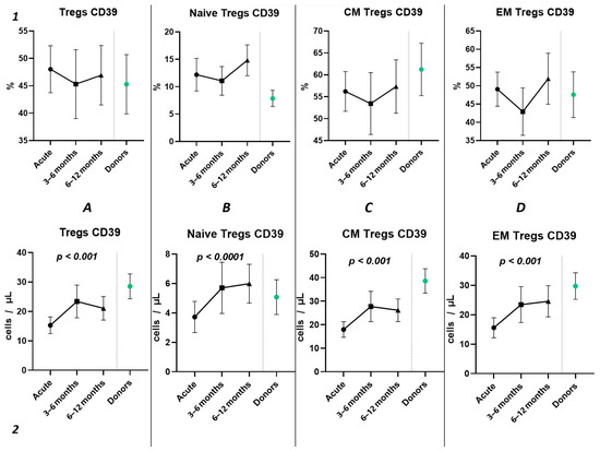 Dynamics of CD39+ T regulatory cell subpopulations. Upper row (1)—relative counts; bottom row (2)—absolute number. (A). Total T regulatory T cells (Tregs). (B). Naïve Tregs. (C). Central memory (CM) Tregs. (D). Effector memory (EM) Tregs.