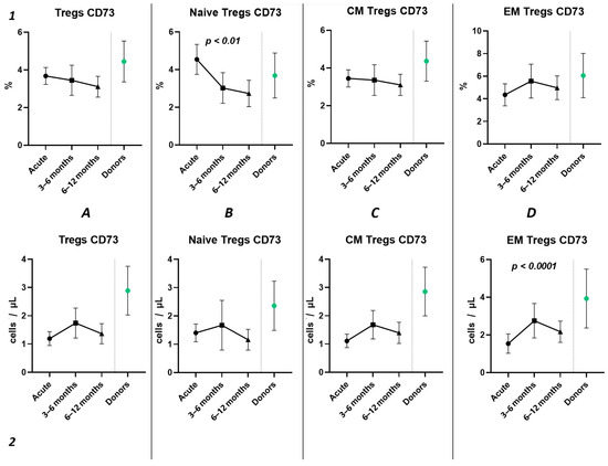 The three-point dynamic assessment of relative and absolute numbers of CD73+ Tregs and their subpopulations. Upper row (1)—relative counts; bottom row (2)—absolute number. (A). Total T regulatory T cells (Tregs). (B). Naïve Tregs. (C). Central memory (CM) Tregs. (D). Effector memory (EM) Tregs. Results presented as mean with 95% CI.
