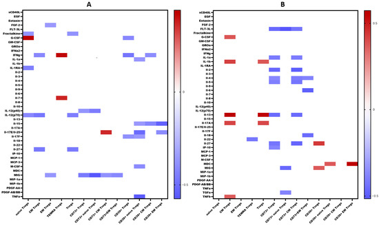 Heat map of correlations between cytokine levels and relative count of Treg subsets in convalescents after COVID-19 (A). At 3–6 months. (B). At 6–12 months. Color scale bar shows a range of correlation coefficients (r). The red color represents a high positive correlation, decreasing to the blue color bar, which represents a negative correlation. Heat map shows only significant correlation coefficients (p < 0.05).