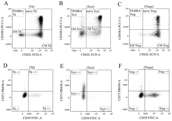 Finally, using the histograms displaying the distribution of T cells based on the expression of ectonucleoside triphosphate diphosphohydrolase-1 CD39 (x-axis) and ecto-5′-nucleotidase CD73 (y-axis) (Figure 13), all the previously identified cell populations were analyzed, including the overall T helper cells (Figure 13D), CD8+ T cells (Figure 13E), and Tregs (Figure 13F), as well as the populations of “naïve cells, central memory cells, effector memory cells, and terminally differentiated effector cells within the aforementioned T lymphocyte populations.