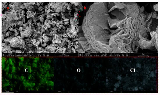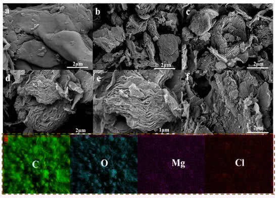 Magnesium bicarbonate was utilized as a hard template in the incorporation of waste walnut shells, leading to the synthesis of dual-template porous carbon at mass ratios of m(walnut shell)/m(magnesium bicarbonate) of 1:2, 1:1, 1:2, and 1:3. Subsequent characterization revealed the influence of different mass ratios on material morphology, pore structure, surface functional groups, and element composition. Scanning electron microscopy was utilized for the analysis of the microscopic characteristics of the materials, and the findings are presented in Figure 1. The surface morphology of WSC prepared using the self-template method exhibits minimal folds without any discernible pores or layered structures (Figure 1a), which is consistent with previous research outcomes [37]. In comparison to Figure 1a, Figure 1b–e illustrate varying degrees of porous structure on the material surfaces. Notably, when magnesium bicarbonate is introduced as a hard template, WSC/Mg-21 displays small-sized loose layered structures on its micro-surface. Distinct lamellar and layered structures are observed for WSC/Mg-11 in Figure 1c. At a magnification level of 2 μm in Figure 1d, a rose-like layered structure can be observed, while further enlargement to 1 μm (Figure 1e) reveals an onion-like laminar flow structure for WSC/Mg-12. With increasing amounts of magnesium bicarbonate added, the lamellar structure disappears in WSC/Mg-13, leaving behind only a loosely packed flocculent structure (Figure 1f). The complete removal of the template (WSC/Mg-12) was confirmed via element mapping and EDS analysis, and the obtained results are presented in Figure 1g and Figure S1. The predominant elements detected in WSC/Mg-12 were carbon and oxygen (88.23% and 10.30%), while magnesium and chlorine (0.10% and 0.07%) contents were found to be negligible. These EDS parameters are elaborated on in Table S1. The microstructure of WSC/Mg, prepared using the dual-template method, has been modified to optimize the exposure of adsorption sites and enhance adsorption efficiency [37]. The current approach to achieving a layered carbon structure in biomass materials typically involves compositing them with bimetallic hydroxide [38]. In contrast, utilizing magnesium bicarbonate as a hard template combined with walnut shells offers a more environmentally friendly and cost-effective method of preparation.