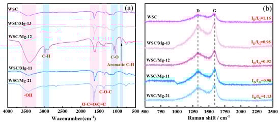 (a) FT-IR and (b) Raman spectra of WSC, WSC/Mg-21, WSC/Mg-11, WSC/Mg-12, and WSC/Mg-13.