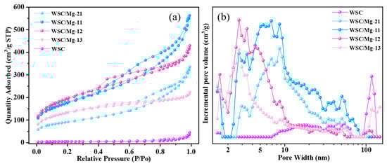 (a) N2 adsorption–desorption curves; (b) pore size distribution of WSC, WSC/Mg-21, WSC/Mg-11, WSC/Mg-12, and WSC/Mg-13.